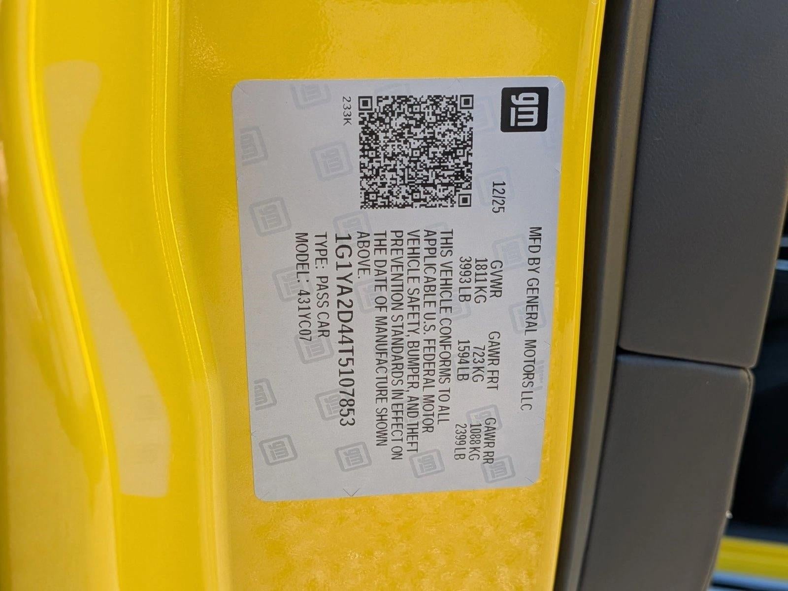 Contact AutoNation Chevrolet West Austin today for information on dozens of vehicles like this 2026 Chevrolet Corvette 1LT. This Chevrolet includes: JET BLACK, MULAN LEATHER SEATING SURFACES WITH PERFORATED INSERTS Leather Seats EXHAUST, PERFORMANCE SEAT BELT COLOR, TORCH RED BATTERY PROTECTION PACKAGE EMISSIONS, FEDERAL REQUIREMENTS, 50-STATE CERTIFIED ENGINE, 6.2L V8 DI, HIGH-OUTPUT High Output 8 Cylinder Engine Gasoline Fuel WHEELS, 19 Aluminum Wheels 1LT PREFERRED EQUIPMENT GROUP ENGINE LIGHTING CARBON FLASH METALLIC-PAINTED OUTSIDE MIRRORS AND SPOILER (WHEN EQUIPPED) SEATS, GT1 BUCKET (STD) Bucket Seats LICENSE PLATE BRACKET, FRONT MIRRORS, OUTSIDE, CARBON FLASH METALLIC-PAINTED CALIPERS, BRIGHT RED-PAINTED LOW-PROFILE REAR SPOILER AND FRONT SPLITTER Rear Spoiler COMPETITION YELLOW TINTCOAT METALLIC EXHAUST TIPS, BLACK TRANSMISSION, 8-SPEED DUAL CLUTCH, INCLUDES MANUAL AND AUTO MODES (STD) 8-Speed A/T Transmission w/Dual Shift Mode A/T TIRES, 245/35ZR19 FRONT AND 305/30ZR20 REAR, BLACKWALL, ALL-SEASON, PERFORMANCE (STD) Tires - Front Performance Tires - Rear Performance *Note - For third party subscriptions or services, please contact the dealer for more information.* Indulge yourself with one of the most highly crafted, most luxurious automobiles available today. Just what you've been looking for. With quality in mind, this vehicle is the perfect addition to take home. Beautiful color combination with Competition Yellow Tintcoat Metallic exterior over Jet Black interior making this the one to own!